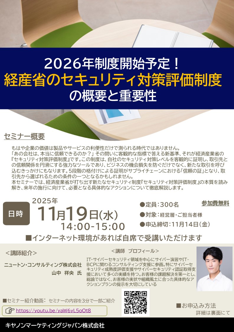 本セミナーでは、経済産業省が打ち出す新たなセキュリティ制度『セキュリティ対策 評価制度』の本質を読み解き、来年の施行に向けて、必要となる具体的なアクション について徹底解説します。